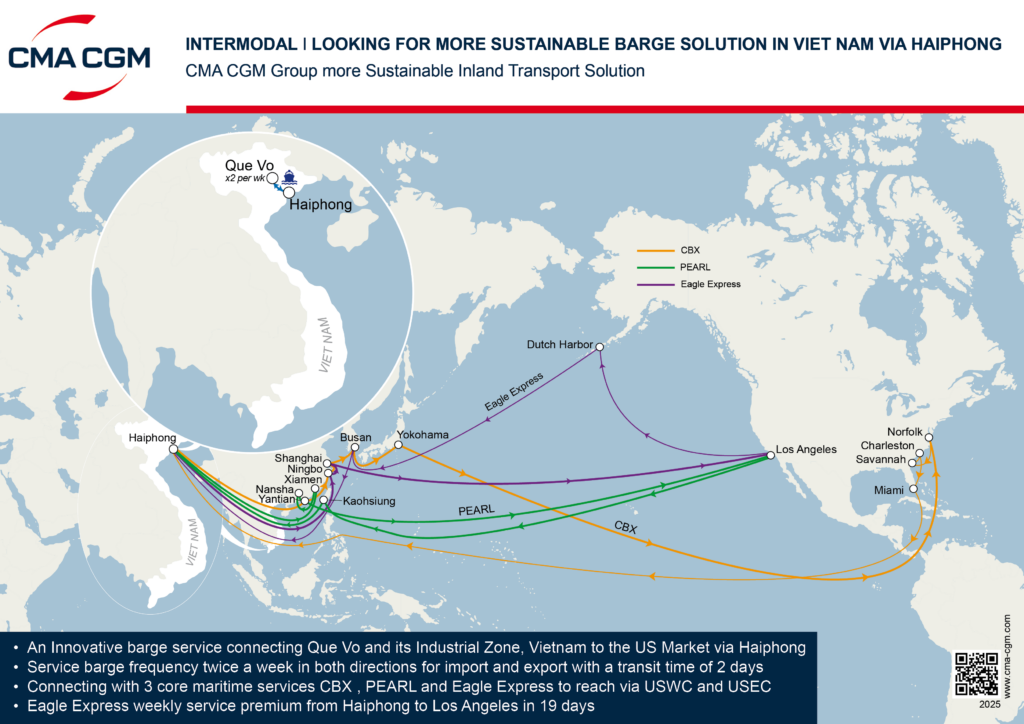 CMA CGM has introduced a new intermodal barge service connecting the Que Vo inland port in Bac Ninh Province to the international gateways of Haiphong. This strategic expansion is designed to streamline cargo flows from Northern Vietnam’s primary industrial hubs directly to the United States market, offering a more sustainable alternative to traditional road transport.