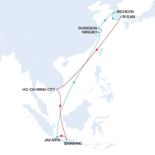 ทั้งนี้ บริการ KI8 มีรอบการวนเรือเริ่มต้นจากท่าเรือ Busan ไปยัง Incheon, Shanghai, Ningbo, Jakarta, Semarang, Ho Chi Minh City และวนกลับไปยัง Busan อีกครั้ง