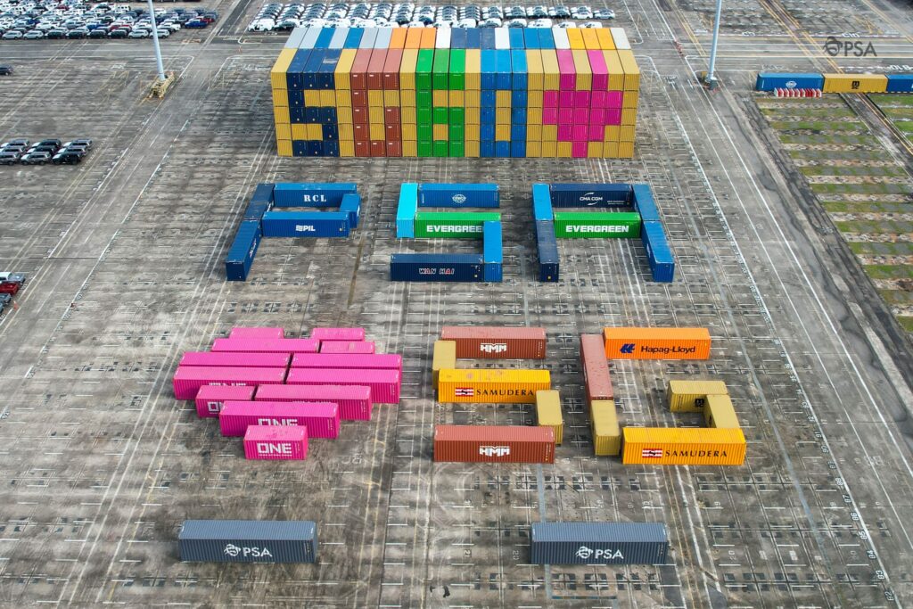เมื่อเร็วๆ นี้ PSA Singapore (PSA) ได้ฉลองวันครบรอบ 60 ปี การก่อตั้งประเทศสิงคโปร์ ด้วยการจัดเรียงตู้สินค้าเป็นคำว่า ‘SG60 ♥’ และ ‘PSA ♥ SG’ ในท่าเทียบเรือ Tanjong Pagar Terminal ซึ่งเป็นท่าเทียบเรือแห่งแรกของสิงคโปร์ที่เปิดให้บริการเมื่อปี 1972 เพื่อสื่อถึงการเดินทางด้านพาณิชย์นาวีของสิงคโปร์ โดยการจัดแสดงตู้สินค้าครั้งนี้ได้มีการประดับไฟให้รับชมในเวลากลางคืนตั้งแต่วันที่ 25 กรกฏาคม ถึงวันที่ 13 สิงหาคมนี้