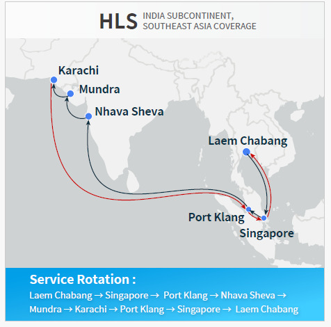 ทั้งนี้ บริการ HLS มีกำหนดเริ่มต้นปฏิบัติการเที่ยวปฐมฤกษ์ออกจากท่าเรือแหลมฉบังในวันที่ 26 เมษายนนี้ โดยมีรอบการวนเรือเริ่มต้นจากแหลมฉบัง ไปยัง Singapore, Port Klang, Nhava Sheva, Mundra, Karachi ก่อนจะวนกลับไปยัง Port Klang, Singapore และแหลมฉบังอีกครั้ง โดยใช้เวลาในการวนเรือทั้งสิ้น 35 วัน