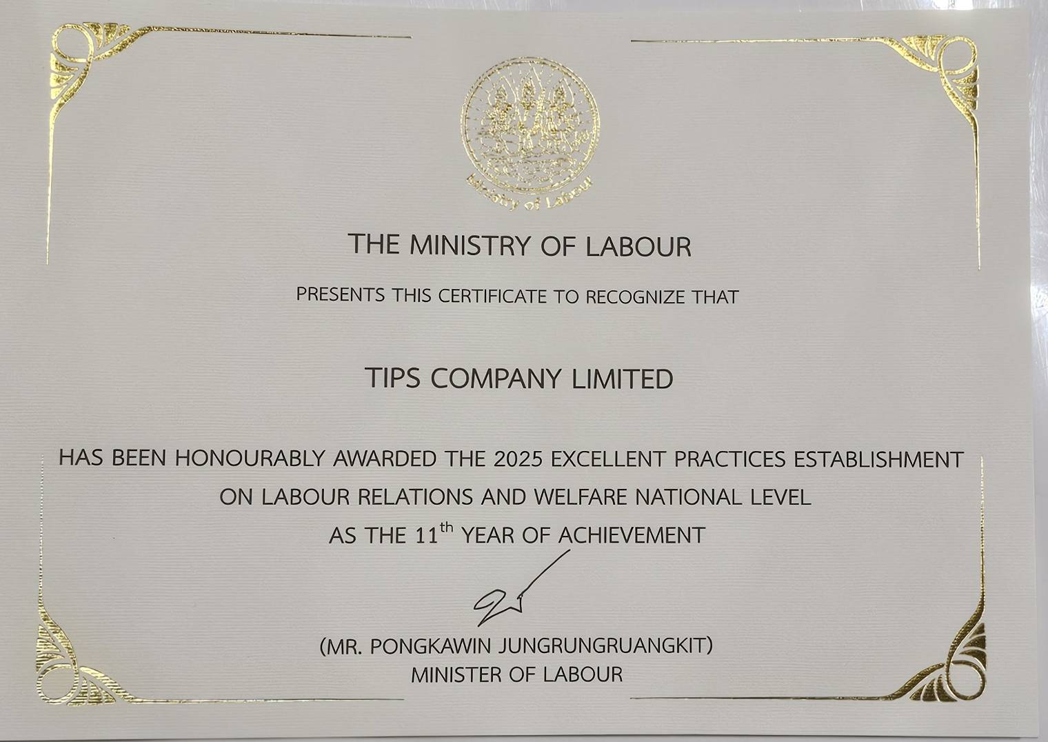 The company celebrated a major milestone in human resources, marking its 11th consecutive year of receiving the Chonburi Labor Management Excellence Award.