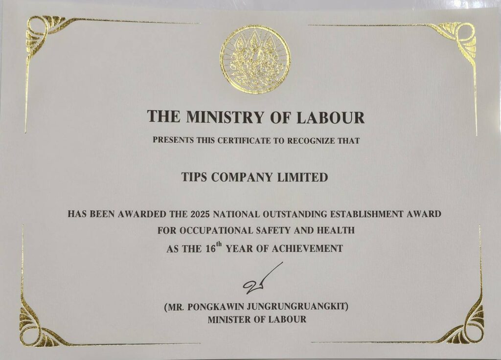 In addition to labor management, TIPS was honored for its rigorous safety protocols. Mr. Teerapol Shinno, Vice President, and Mr. Chakrit Tonsuwan, Safety, Health and Environment Division Manager, accepted the Platinum Award in Safety.